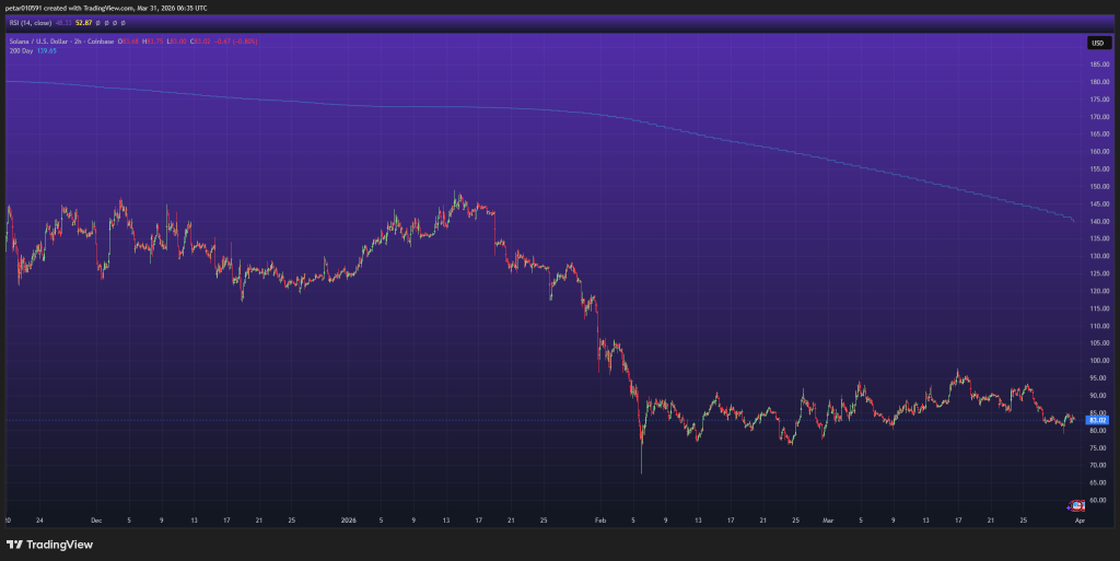 Solana торгуется на уровне $83.02 на двухчасовом графике. 200-дневная скользящая средняя находится на $139.65, далеко выше текущей цены. Цену SOL сильнее всего «придавило» в более широком распродаже: она упала с максимумов выше $200.