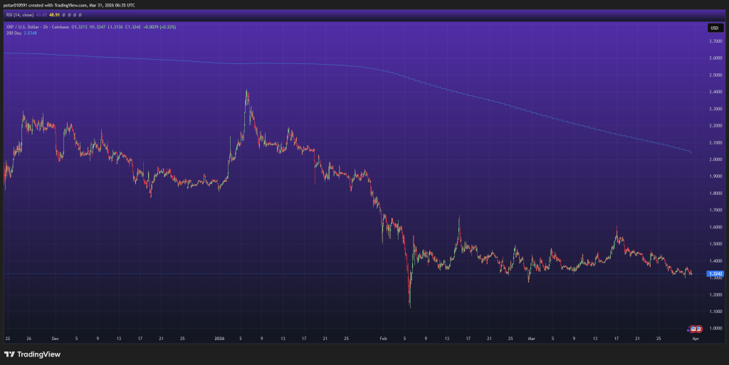 Двухчасовой график TradingView показывает, что цена XRP торгуется на уровне $1.3242. Цена находится значительно ниже 200-дневной скользящей средней на $2.0348. Это медвежья структура, но окончание войны меняет уравнение.