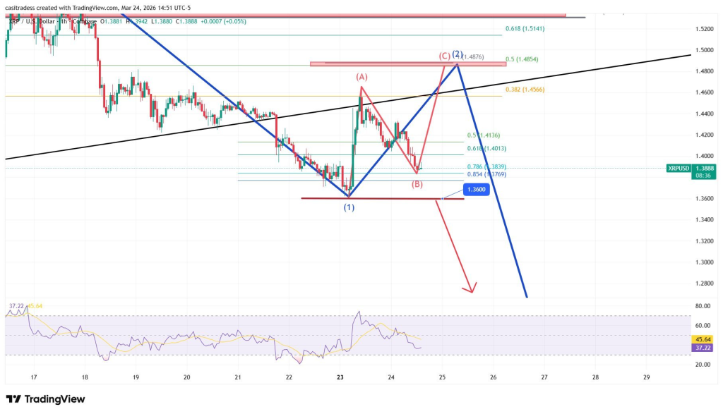 Два возможных сценария выделяются из текущей ситуации. Пробой ниже уровня поддержки $1.35 может открыть путь к диапазону $1.09 — $0.87, описанному Каси. Такое движение завершит коррекционную волну и потенциально сбросит структуру рынка.