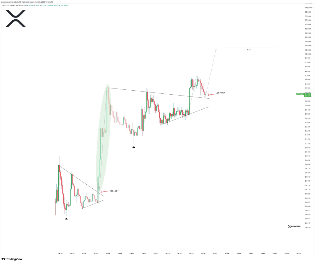 На графике, опубликованном в треде, выделена многолетняя консолидационная модель, из которой XRP вышел ранее в этом году. После пробоя зоны сопротивления цена вернулась назад, чтобы повторно протестировать бывшее сопротивление как поддержку; классический технический ход, который отделяет устойчивые пробои от ложных.
