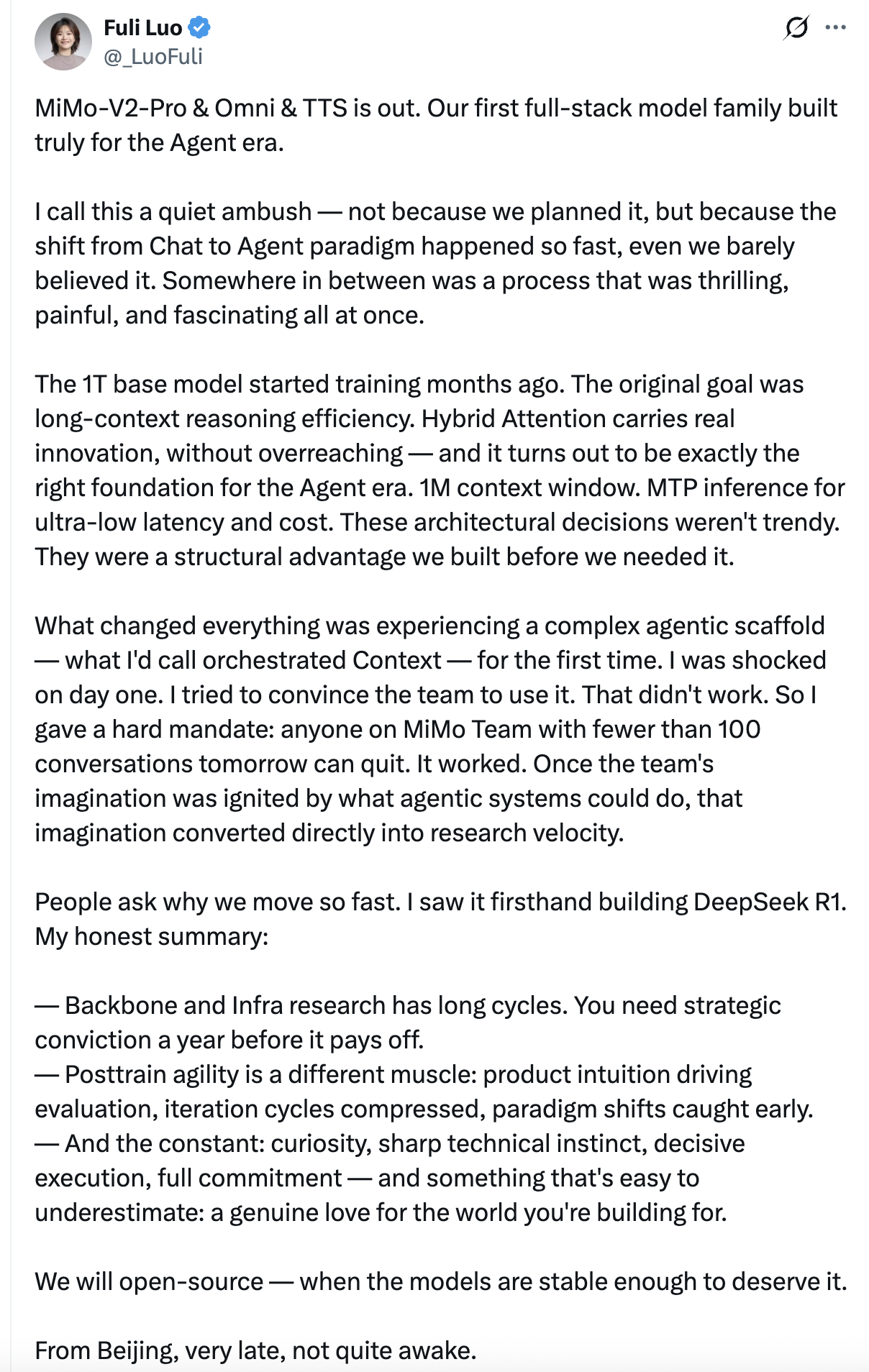 В качестве руководителя этой модели, Луо Фули также прямо заявил на зарубежных социальных платформах: «До завтра в команде MiMo те, кто провел менее 100 диалогов в тестах, могут сразу уволиться. Этот подход сработал. Как только воображение команды зажжено возможностями системы искусственного интеллекта, это воображение немедленно превращается в скорость разработки.»