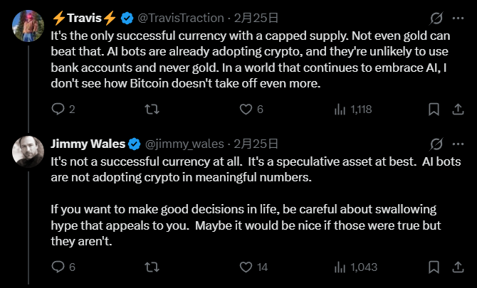 อย่างไรก็ตาม โพสต์ของเวลส์ก็กลายเป็นชนวนให้ผู้สนับสนุน Bitcoin โต้ตอบอย่างรุนแรง หลายคนโต้แย้งว่า Bitcoin ได้พิสูจน์แล้วในสภาวะเงินเฟ้อทั่วโลก ว่าเป็นทรัพย์สินที่หายากในดิจิทัล บางคนก็แนบภาพกราฟราคาประวัติศาสตร์ของ Bitcoin หรือแชร์ภาพหน้าจอผลกำไรจากการถือครอง Bitcoin ของตนเองเพื่อคัดค้านความเห็นของเขา นอกจากนี้ ยังมีผู้ใช้งานบางรายแชร์ประสบการณ์การถือครอง Bitcoin ระยะยาวและใช้ชีวิตด้วย Bitcoin วิจารณ์ความคิดของเวลส์ว่าเป็นความคิดล้าสมัย บางคนยังชี้ให้เห็นว่า เวลส์ตั้งใจเลือก “ปี 2050” ซึ่งเป็นเวลาห่างไกลเกือบ 25 ปี เพื่อทำเป็นการคาดการณ์ที่ไม่สามารถตรวจสอบได้ในระยะสั้น เพื่อหลบเลี่ยงอารมณ์เชิงบวกของตลาดหลังจาก ETF ของ Bitcoin ได้รับการอนุมัติในปัจจุบัน