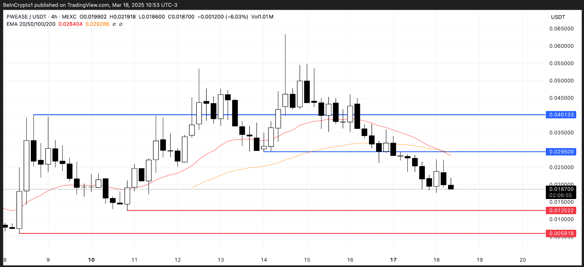 ! altcoins 3 อันดับแรกถูกขายโดยกระเป๋าเงิน Smart Money ในเดือนมีนาคมPWEASE การวิเคราะห์ราคา | ที่มา: TradingView หากการปรับฐานยังคงดําเนินต่อไป PWEASE สามารถลดลงเพื่อทดสอบแนวรับที่สําคัญที่ $0.0125 หากไม่สามารถถือเกณฑ์นี้ได้ โทเค็นจะมีความเสี่ยงลดลงอีกเป็น $0.0059