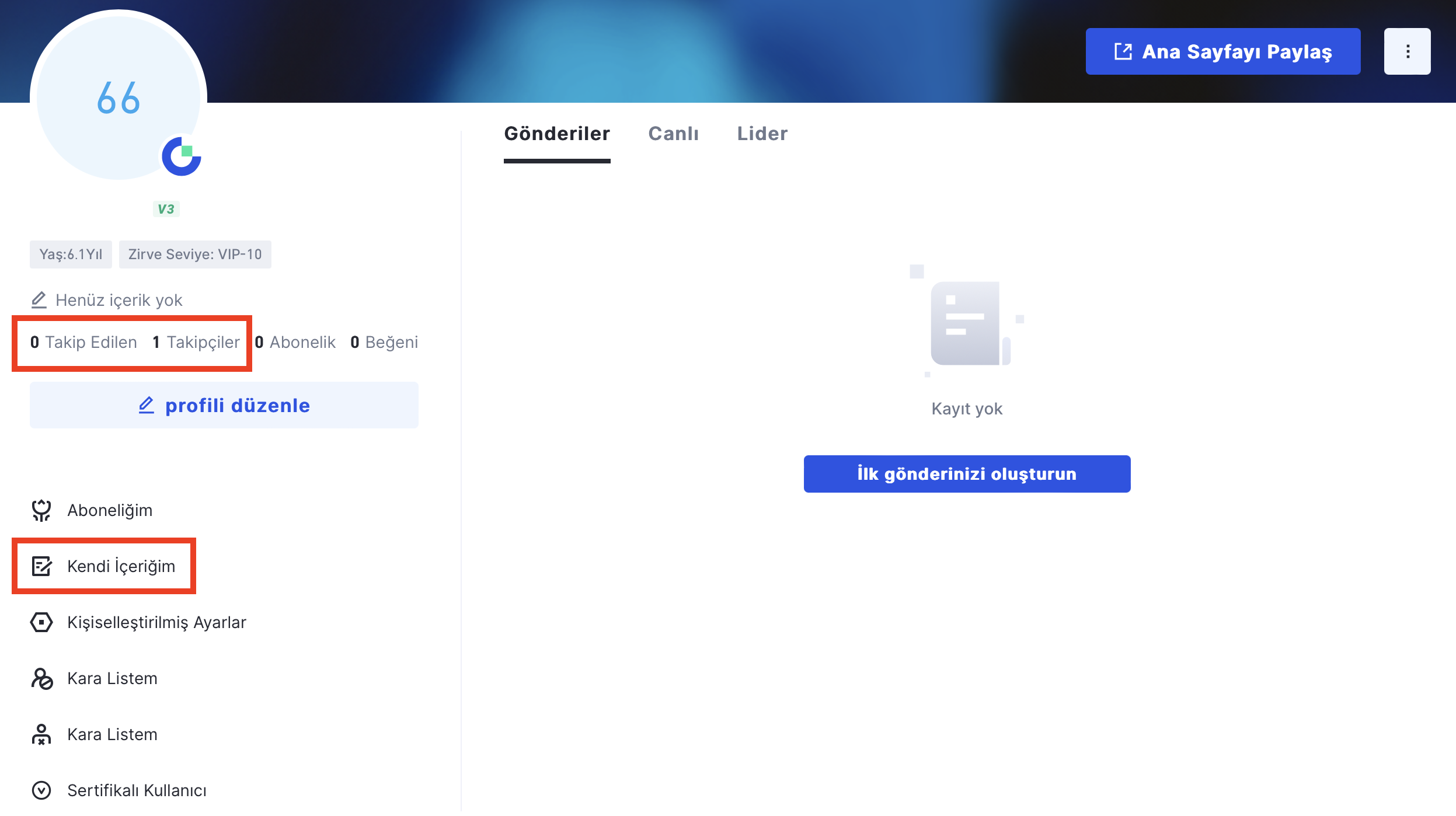 "Profil" sayfasında, [Takipçiler] bölümünde takipçilerinizin sayısını ve [Takip Edenler] bölümünde takip ettiğiniz kullanıcıların sayısını görüntüleyebilirsiniz. "Özel Abonelik" sayfasına girmek için "Oluşturma merkezim "e tıklayın. page.