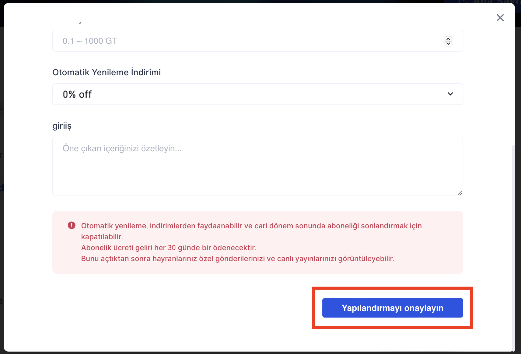 Otomatik yenileme için bir indirim oranı seçin. İndirim oranları mevcuttur: 0%, 10%, 20%... 90%. *Otomatik yenilemeyi işaretleyen kullanıcılar ayarlanan indirimden sürekli olarak yararlanabilir ve bir dönem sona erdiğinde otomatik yenilemeyi durdurmayı seçebilir.
