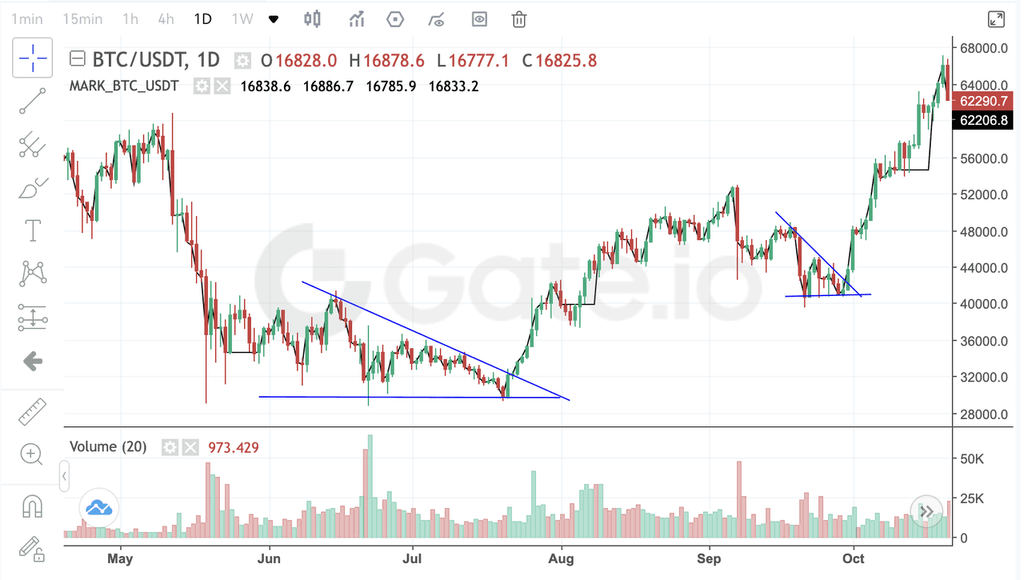 Resim, Gate BTC vadeli işlemlerinin günlük mum grafiğini göstermektedir. 15 Haziran 2021 ile 21 Temmuz 2021 arasında BTC, 58.000 dolarlık bir zirveden yaklaşık 30.000 dolara düştü. Bu düşüşü yatay bir konsolidasyon dönemi izledi. Yaklaşık 41.000 dolara toparlandıktan sonra alçalan bir üçgen formasyonu oluşturmaya başladı. Bununla birlikte, fiyat 32.500 dolara ulaştığında, alçalan üçgenin üst sınırını aştı ve piyasayı yeni bir zirveye taşıyan yeni bir yükseliş eğilimine yol açtı.