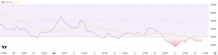 The Relative Strength Index (RSI) of Berachain is currently at 24.19 and has remained below the oversold threshold of 30 since April 7. The ongoing weakness of the RSI indicates sustained downward pressure and the token is struggling to regain upward momentum.