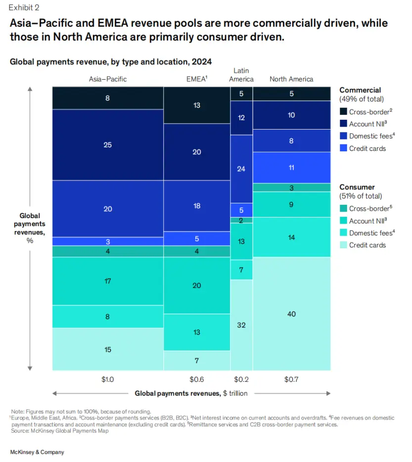 Overall, global payments revenue is split almost evenly between consumer and commercial segments, but regional compositions differ significantly.