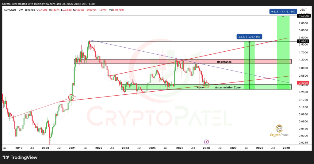 At the time of the chart, ADA is trading around $0.40 after a deep multi-year correction from its all-time high. Instead of collapsing further, the Cardano price has stabilized inside a broad accumulation zone that has held through multiple market cycles. That stability is what Patel argues matters most right now.