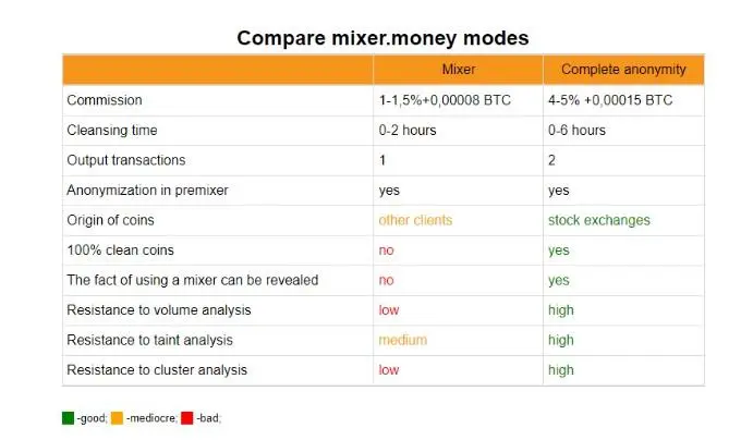 Effective bitcoin mixers offer a variety of transaction mixing methods. For example, Mixer.Money offers users Mixer and Complete Anonymity modes. Mixer is a simple mode with a low fee to quickly clean coins. You send bitcoins as described above, they are anonymized and sent to the exchange. And you get the already cleaned coins of the users of the Complete Anonymity mode