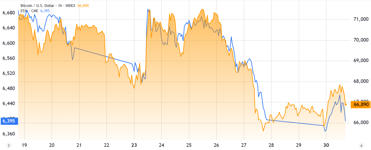 _S&P 500 futures (left) vs. Bitcoin/USD (right). Source: _TradingView