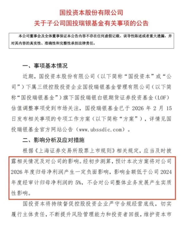 The announcement clearly states that the Silver LOF compensation plan for Guotou Ruixin Fund is expected to have a negative impact on Guotou Investment’s net profit attributable to shareholders in 2026, not exceeding 5% of its audited net profit attributable to shareholders in 2024, and will not have a substantial impact on the company’s overall business development.