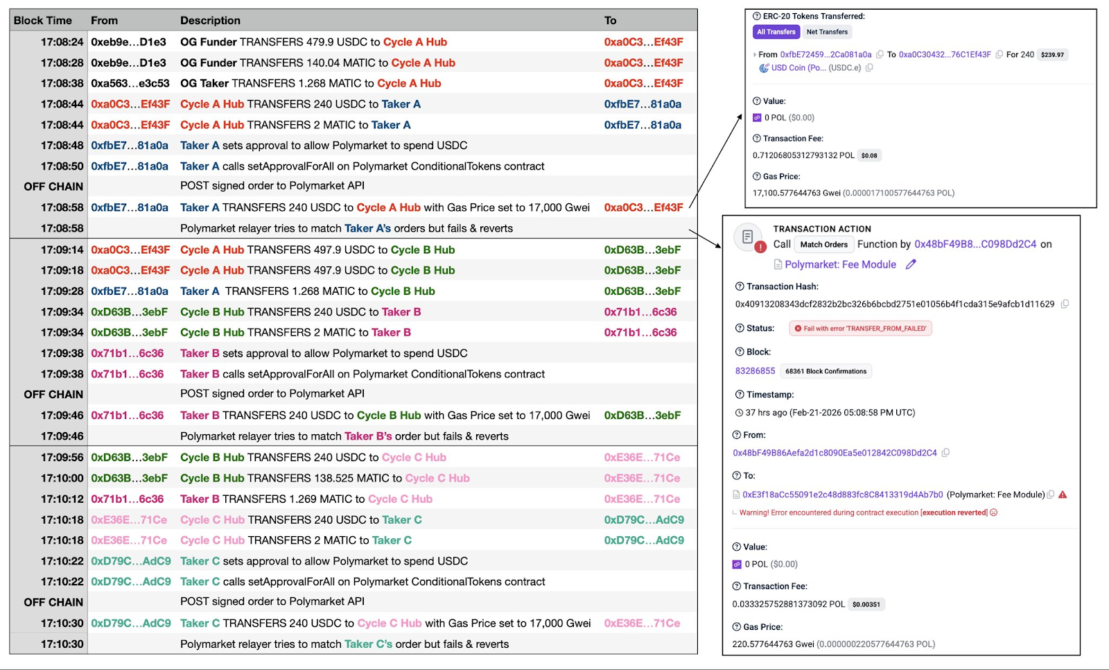 Each attack cycle costs less than $0.10 in Gas on Polygon, takes about 50 seconds, and theoretically can be executed around 72 times per hour. An attacker set up a “dual-wallet cycle system” (Cycle A Hub and Cycle B Hub alternating) to automate high-frequency attacks. Hundreds of failed transactions have already been recorded on-chain.