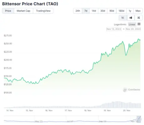 At the time of writing, TAO is valued at $265, reflecting a commanding increase of 80% in the last seven days and an impressive leap of nearly 400% in the last 30 days.