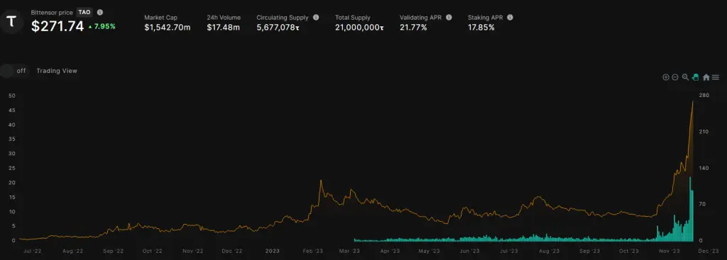 Based on data by TradingView, TAOUSDT tallied an all-time high of $267 on Monday, and boasts a market capitalization exceeding $1.27 billion.