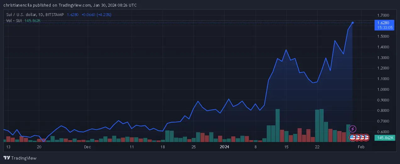 In a stunning comeback, the price of Sui token has soared to new heights, painting an impressive picture in the cryptocurrency market. Reaching an impressive $1.61 on the back of a solid 50% weekly rally on Tuesday – its highest point since May 3rd of the previous year – Sui has proven to be one of the standout performers of 2024. With an astronomical surge of over 328% from its lowest level in 2023, Sui has solidified its position as one of the most successful cryptocurrencies of the year.
