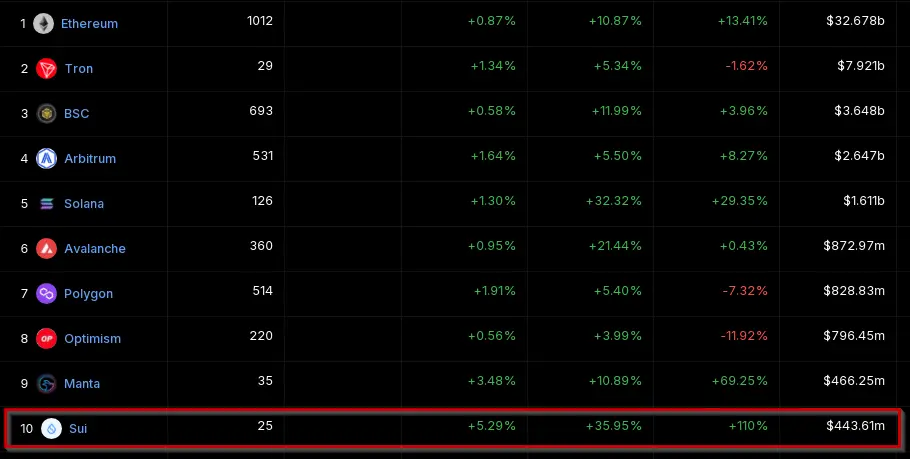 SUI enters the Top 10 list. Source: Defillama