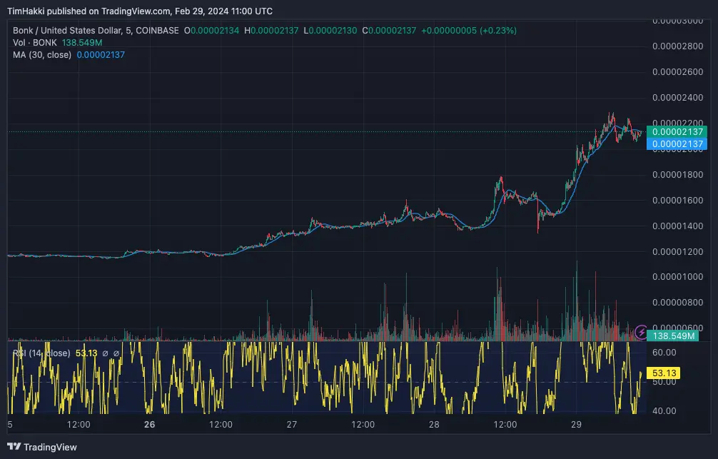 A quick look at BONK’s chart suggests this current rally may lose steam pretty quickly. On 5-day analysis, cup-and-handle patterns have stopped appearing in BONK’s candles, which suggests the bull cycle might be winding down.