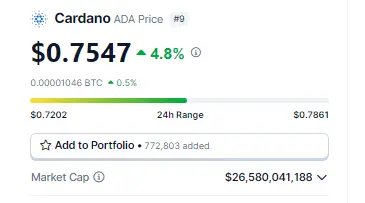Optimism surrounds Cardano (ADA) despite some recent hiccups. ADA stands resilient, maintaining a positive outlook despite a 5% decrease over the past week. Currently priced at $0.75, ADA demonstrates a robust stance with a 24-hour trading volume of $1.14 billion and a market capitalization of $24 billion.