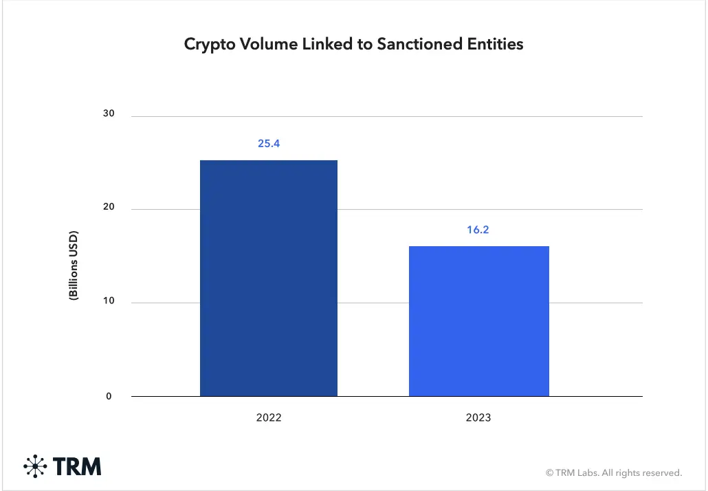 Also, sanctions volume was the largest driver of the overall decline last year. Crypto value linked to sanctioned entities fell 30% from $25.4 billion in 2022 to $16.2 billion in 2023.