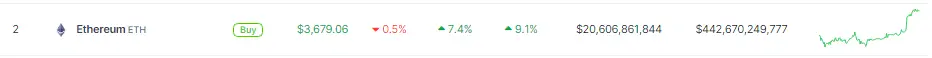 ETH has seen its price jump nearly 10% in the past 24 hours, reaching $3,679 as of today. This impressive gain is accompanied by a significant rise in trading volume, which has spiked by nearly 70%, surpassing $15 billion.