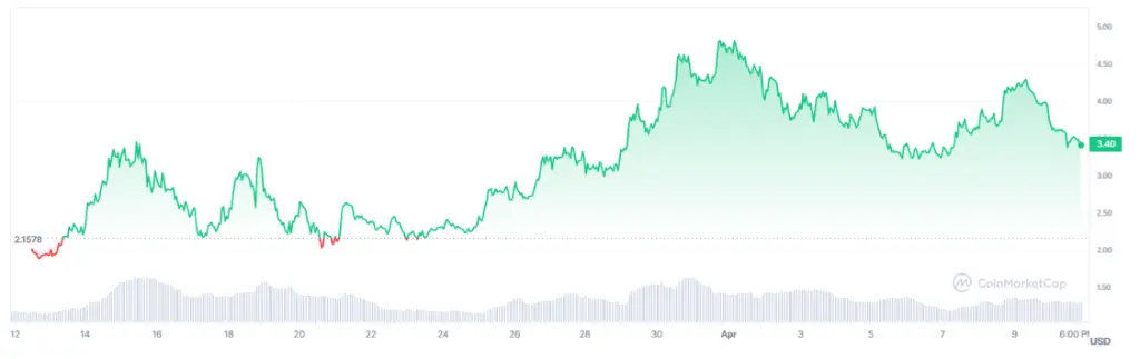 WIF’s price has risen by 90% during the past month, adding an enormous $0.32 on average to its present price tag. This rapid rise indicates that if the coin keeps growing, it has the potential to become a reliable asset.