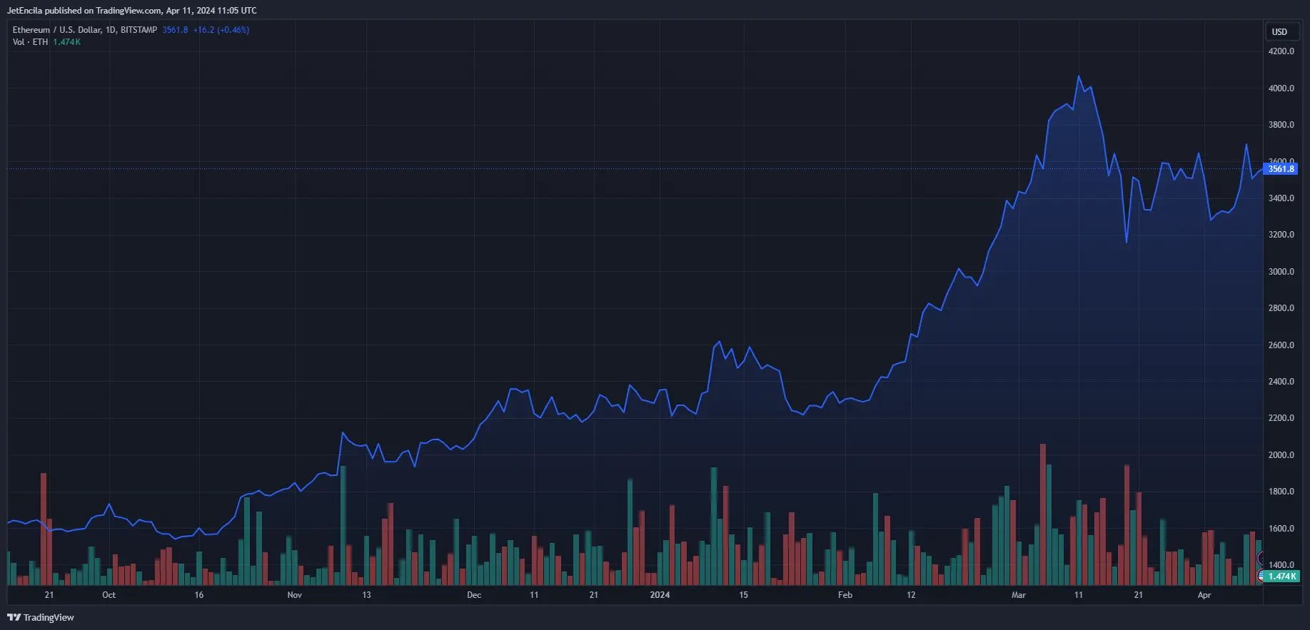 Ethereum is now trading at $3561.8. Chart: TradingView