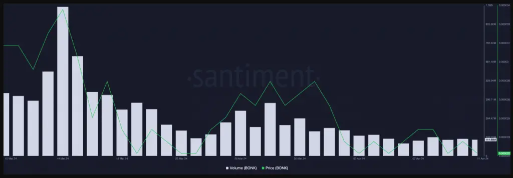 The 30-day period under review has seen a significant fall in Bonk’s daily trading volume, with Santiment’s data indicating a 75% decrease.