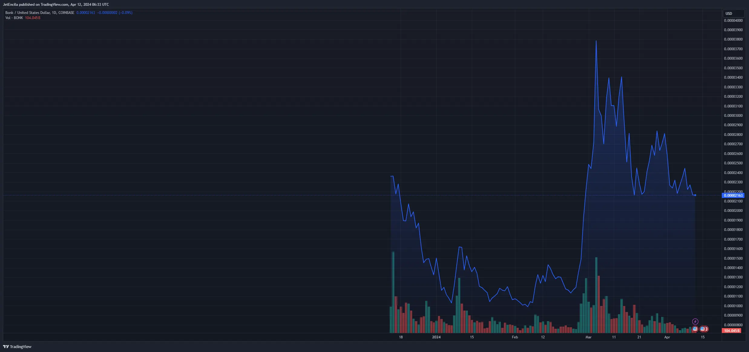 BONKUSD trading at $0.000021on the daily chart: TradingView.com