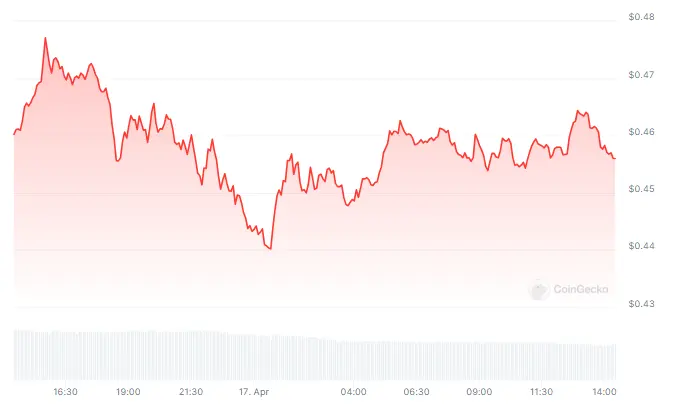 At the time of writing, ADA was trading at $0.45, down 1.8% and 21.9% in daily and weekly timeframes, data from Coingecko shows.