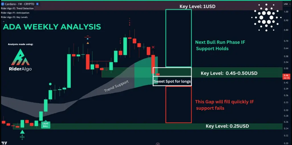 Should ADA breach this support level, analysts warn of a potential plunge to $0.25. However, if Cardano manages to hold this level, it could signal the formation of a double bottom, potentially paving the way for a rally towards the $1 mark.