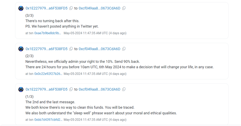 The attacker, operating under the alias “FakePhishing327990” on Etherscan, sent $153,000 Ether to the victim, accompanied by a message expressing willingness to negotiate and seeking communication via Telegram.