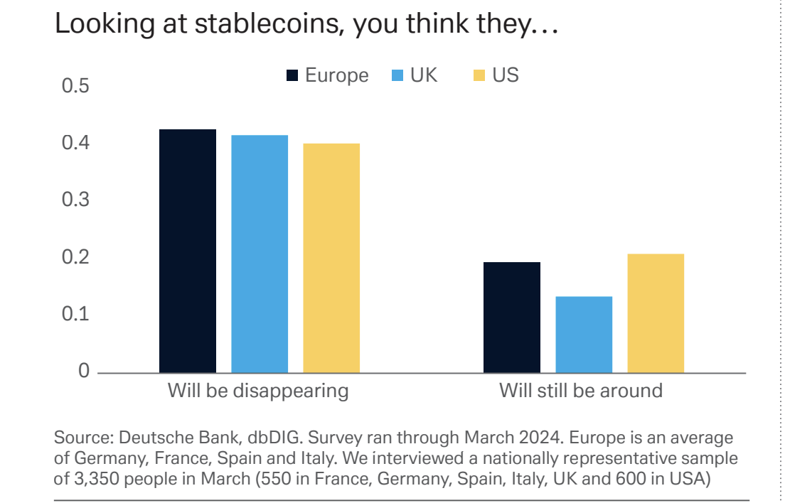 The German banking giant surveyed over 3,350 consumers in March (550 in France, Germany, Spain, Italy, UK each and 600 in USA), questioning the stability of stablecoins.