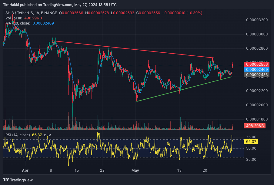 However, the token’s performance over the last three months shows it facing stiffening resistance (indicated by the red trend line), even as its support level (green trend line) is increasing. The data indicates $SHIB’s price has been relatively stable over the last month as it consistently trades slightly above its 30-day moving average, represented by the graph’s blue line.
