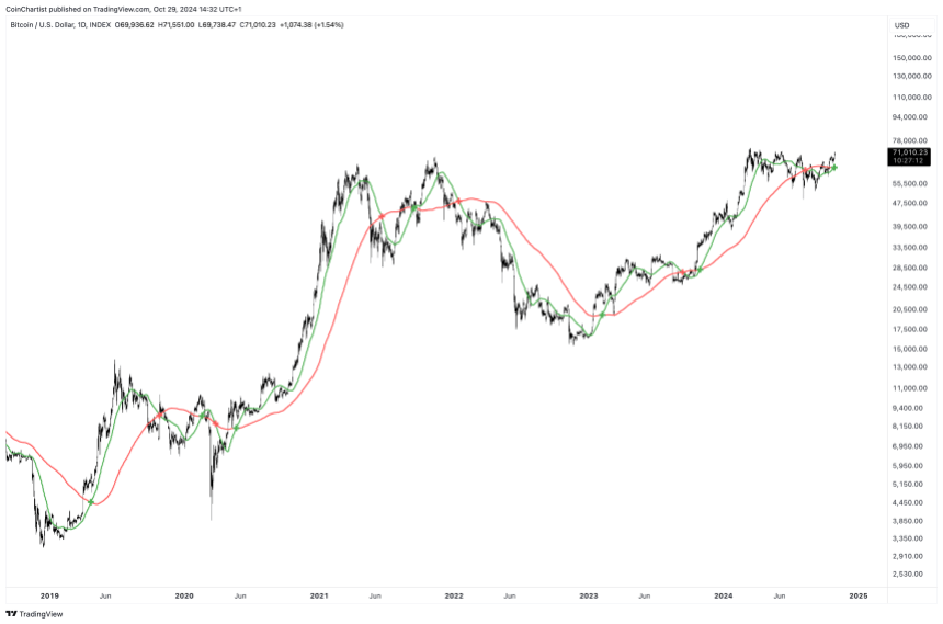 Bitcoin price is now above $70,000 per coin. The recent rally back toward local all-time highs has carried BTCUSD high enough to causes two important moving averages to form a “Golden Cross.” This signal has appeared twice since the bear market bottom and yielded significant results. Let’s take a look at the data and the most recent signal now that it has confirmed.