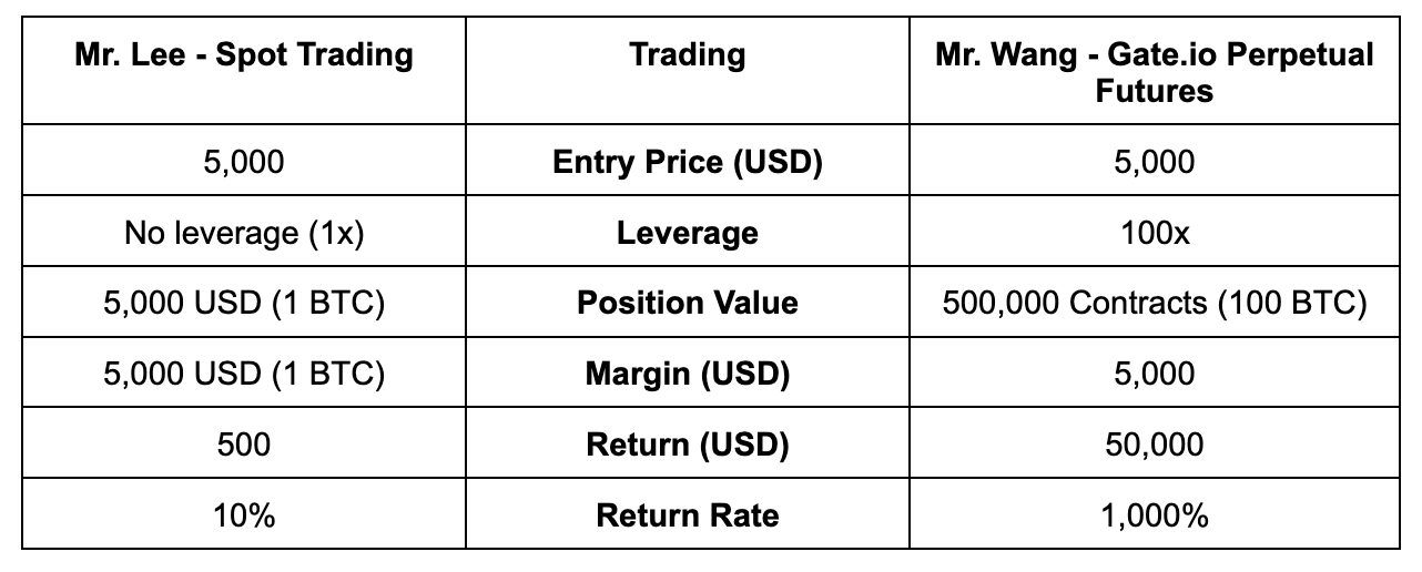 Поточна ціна Біткоіна становить 5000 доларів США. Містер Лі та пан Ван налаштовані на підвищення ціни Біткоіна. Містер Лі купує 1 BTC на спотовому ринку. Пан Ван використовує 1 BTC як маржу, щоб купити 500 000 безстрокових контрактів (еквівалент 100 BTC) із 100-кратним кредитним плечем. Якщо ціна BTC підніметься до 5500 доларів США, пан Лі заробить 500 доларів США, ставка прибутку 10%, а пан Ван заробить еквівалент 10 BTC, ставка прибутку 1000%.