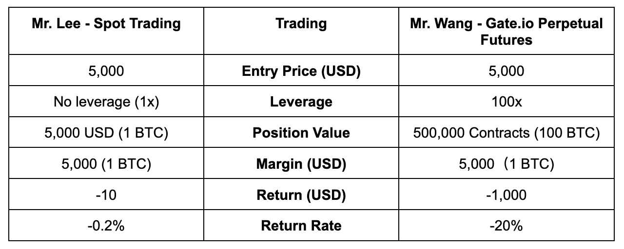 Наразі ціна BTC становить 5000 доларів США, і пан Лі, і пан Ван налаштовані на підвищення. Містер Лі купує 1 BTC на спотовому ринку, тоді як пан Ван вирішує використовувати 500 000 безстрокових контрактів (еквівалент 100 BTC) із 100-кратним кредитним плечем у 1 BTC як маржу. На жаль, ціна BTC не зростає, а пізніше падає до 4990 доларів США. Пан Лі втрачає 0,2%, а пан Ван – 20%.