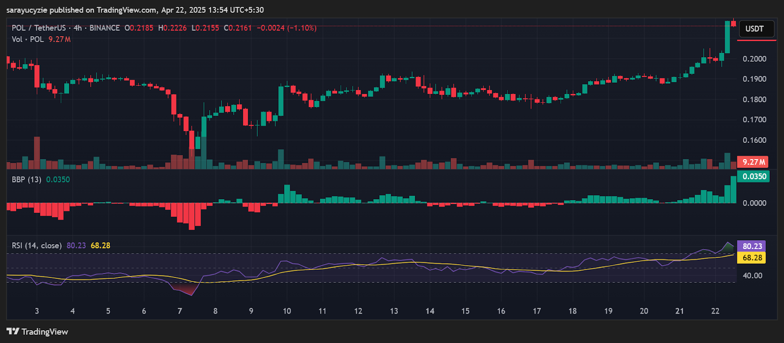 ! *Графік POL (Source: TradingView)*Крім того, активні ринкові настрої активу перекуплені: індекс відносної сили (RSI) виявлений на рівні 80,23, що натякає на потенційний відкат або корекцію. Значення (BBP) Bull-Bear Power 0,0350 показує, що бики домінують на ринку.
