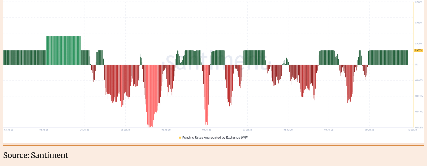 Дані Santiment показують, що комбінована ставка фінансування WIF на біржах стала позитивною 10 липня на рівні 0,005% (попередній день була негативною). Перехід ставки фінансування з негативної в позитивну означає, що інвестори в контракти шалено відкривають довгі позиції (купують), що свідчить про загальне ставлення ринку до продовження зростання. Феномен премії на безстрокових контрактах відображає крайній оптимізм ліквідності щодо майбутніх ринкових перспектив.