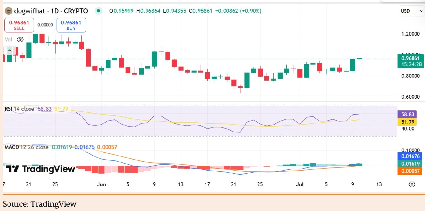 Meme монета WIF з недавнього дна 0.82 долара сильно відновилася на 30%, досягнувши максимуму 1.0668 долара (висока точка місяця). Цей великий памп сприяв тому, що її ринкова капіталізація різко зросла до 10.53 мільярда доларів (зростання за день понад 15%), в той же час об’єм у блокчейні різко зріс на 105% досягнувши 5 мільярдів доларів, що свідчить про величезний приплив коштів в цей актив.
