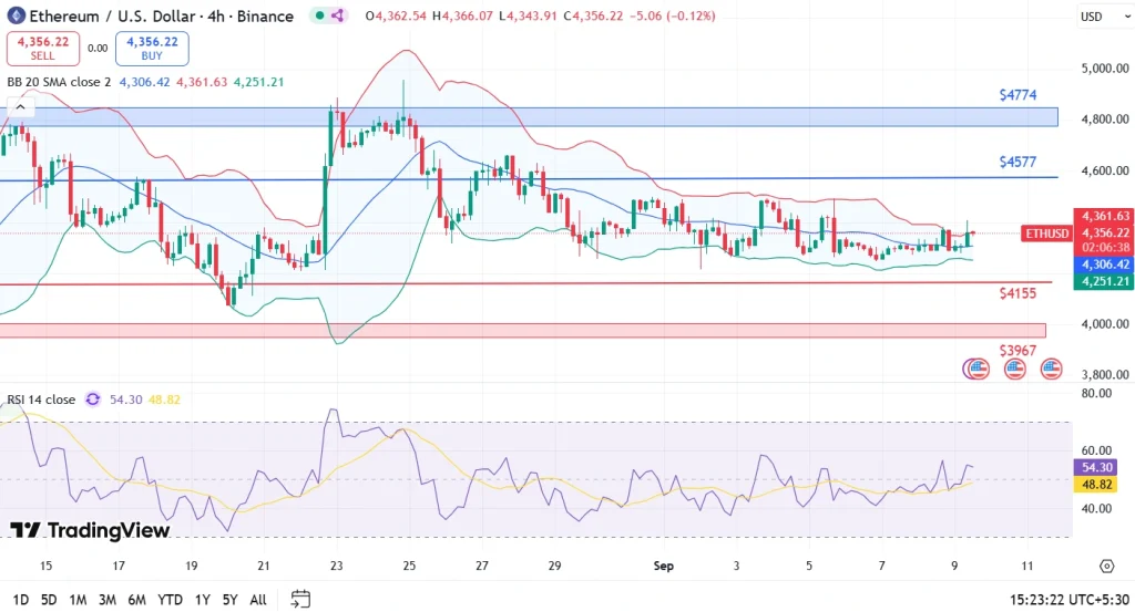 ! Аналіз цін ETH 9-9-25 Навпаки, підтримка на рівні $4,155 залишається життєво важливою. Якщо цей рівень не витримає, ETH може відвідати зону $3,967. Наразі RSI становить 54.3, що вказує на нейтральну позицію, але з невеликим бичачим нахилом. Тим часом, MACD залишається негативним, підкреслюючи обережність, навіть коли наростає імпульс.