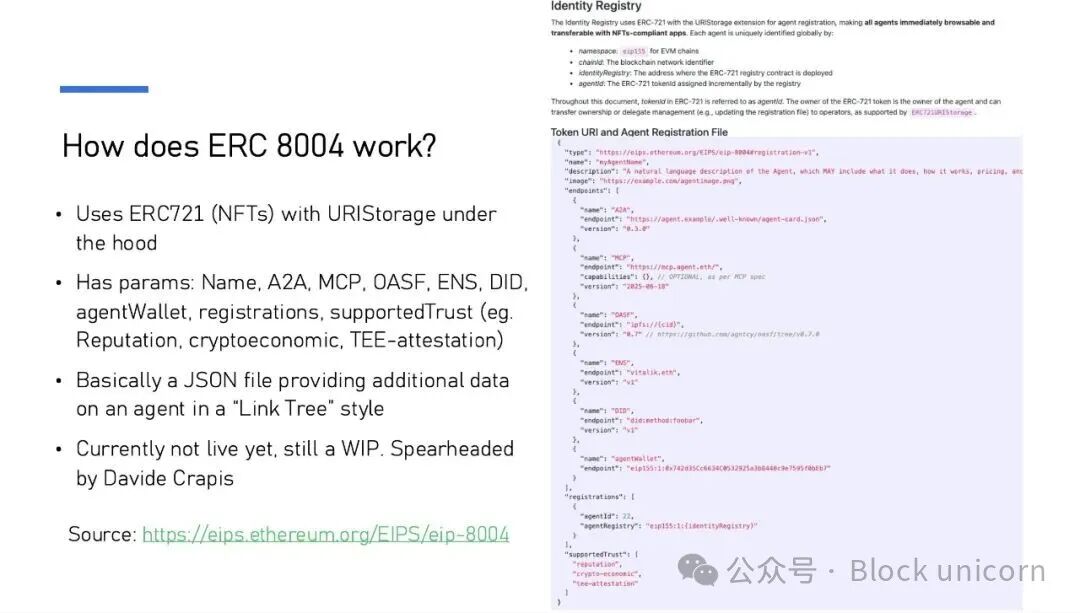 ERC 8004 на базовому рівні використовує ERC721 (NFT) та URIStorage. Він містить такі параметри, як Name, A2A, MCP, OASF, ENS, DID та підтримувані типи довіри (наприклад, репутація, криптоекономіка, TEE підтвердження). Усі ці різні параметри вказують на різні стандарти агентських ID, що дозволяє більш повно відобразити функціональність агентів.