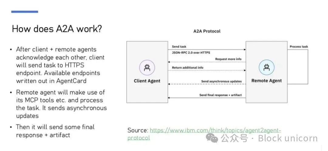 У протоколі A2A, після взаємного підтвердження клієнта та віддаленого агента, клієнт переглядає картку агента, щоб отримати HTTP-кінцеву точку, та запитує відповідну службу. Віддалений агент використовує свої інструменти MCP та обчислювальні ресурси тощо, і під час виконання завдання надсилає асинхронні оновлення (подібно до “мислення” в моделі міркування). Нарешті, він надсилає остаточну відповідь і артефакти.