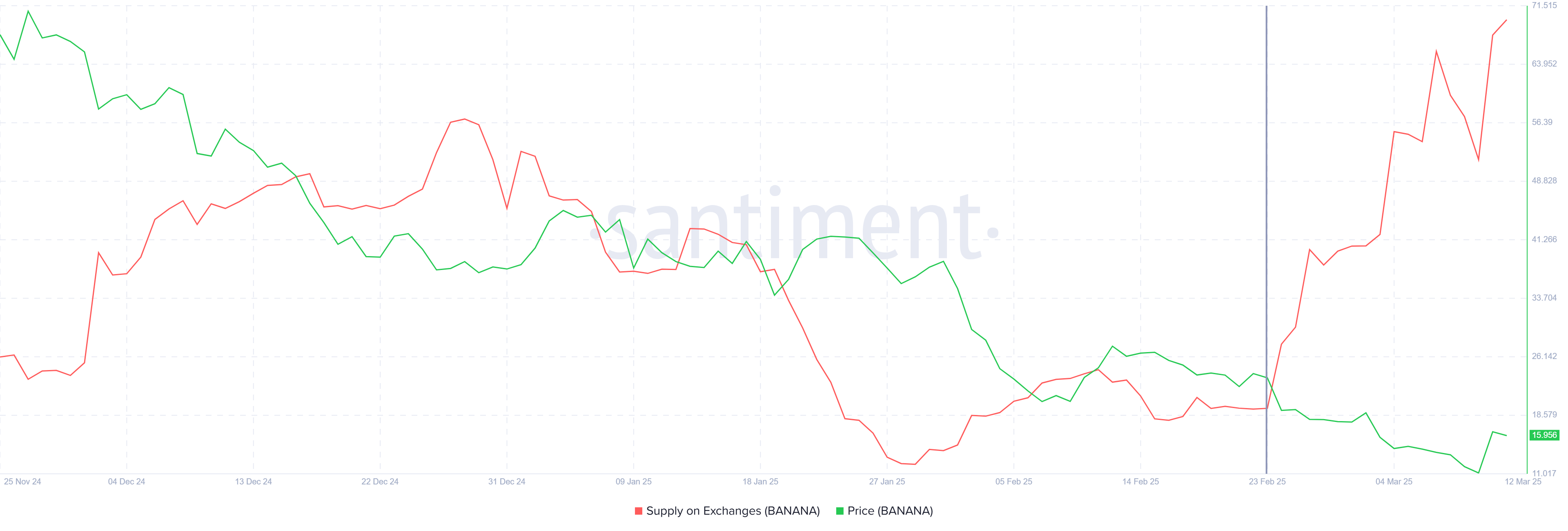 Протягом останніх двох тижнів обсяг постачання бананів на біржах збільшився на 300,000 токенів, що оцінюється приблизно в $5 мільйонів. Це збільшення продажного тиску становить приблизно 9% від загальної ринкової капіталізації, яка складає $55 мільйонів. Зростаючий обсяг постачання на біржах є безпосереднім наслідком неспроможності альткоїна утримати своє відновлення, що призвело багатьох інвесторів до продажу та фіксації прибутків.