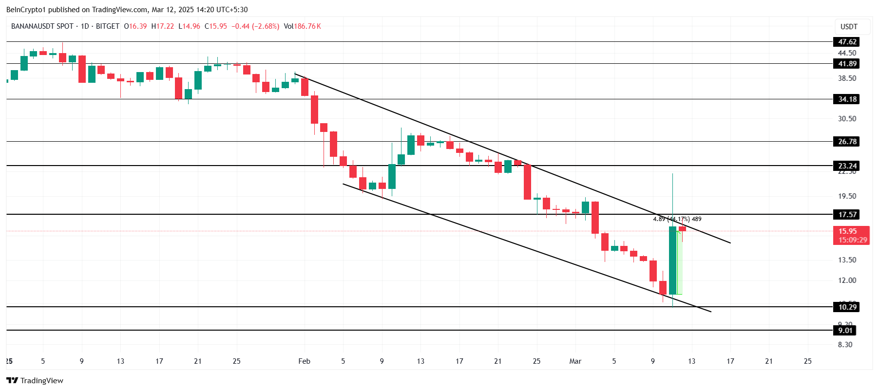 На даний момент Banana торгується за $15.95 після зростання на 44% протягом останнього дня, знаходячись в межах спадаючого клина, що зазвичай сигналізує можливість бичачого руху. Проте, незважаючи на цю схему, альткоїн мав проблеми зі зривом протягом останніх 24 годин, залишаючи його майбутнє невизначеним.