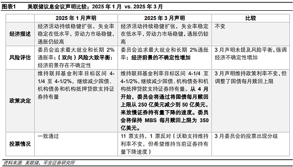 Політичне мислення: Перспективи економіки та зниження процентних ставок ще потребують переоцінки; Уповільнення скорочення балансу може бути тимчасовим заходом. Чи готова ФРС своєчасно знижувати відсоткові ставки, щоб захистити економіку та фондовий ринок на тлі зростання інфляційних ризиків? З цієї зустрічі нам важко судити. ФРС, можливо, навмисно висловила оптимізм щодо економіки США. Однак у нас є застереження щодо думки Пауелла про те, що «жорсткі дані» економіки США все ще стійкі. Що стосується інфляції, то також є підстави для занепокоєння, що судження ФРС є надмірно оптимістичним: ФРС, можливо, не повністю оцінила вплив тарифів; Ризик зростання інфляційних очікувань не сприймається всерйоз. На наш погляд, порівняно з еталонним очікуванням зниження процентної ставки на 50 базисних пунктів за весь рік, більш ймовірним відхиленням є те, що знижувальний тиск на економіку США перевищує поточний прогноз ФРС, що, у свою чергу, створює ризик того, що ФРС знизить процентні ставки занадто пізно в першій половині року і «компенсує зниження» у другій половині року, що призведе до фактичного зниження ставки більш ніж на 50 базисних пунктів за весь рік. Позитивним фактором є те, що ФРС відносно рішуче оголосила про уповільнення скорочення балансу, що призведе до скорочення пропозиції казначейських облігацій на ринку та зниження прибутковості казначейських облігацій. Це також може бути важливим фактором для ФРС, щоб поки що «залишатися на місці» щодо процентних ставок.