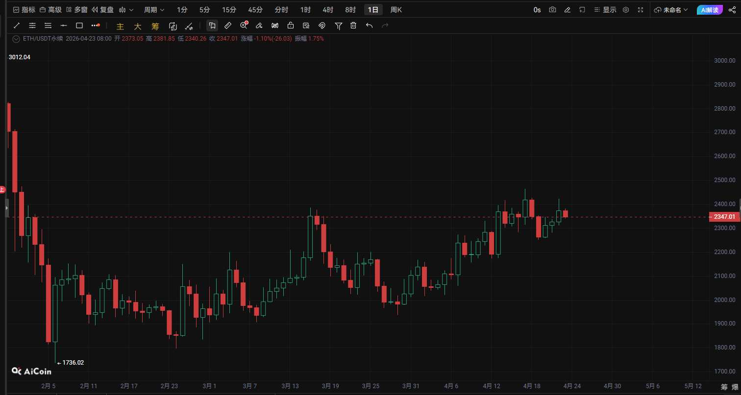截至 4月23日,Ethereum(ETH) 当前报价 2345 USDT。从整体K线结构来看,以太坊已经完成了 1736美元阶段底部构筑,并逐步走出趋势修复行情。目前价格正在 2300上方反复震荡蓄力,这一位置正是多空博弈最激烈的区域。