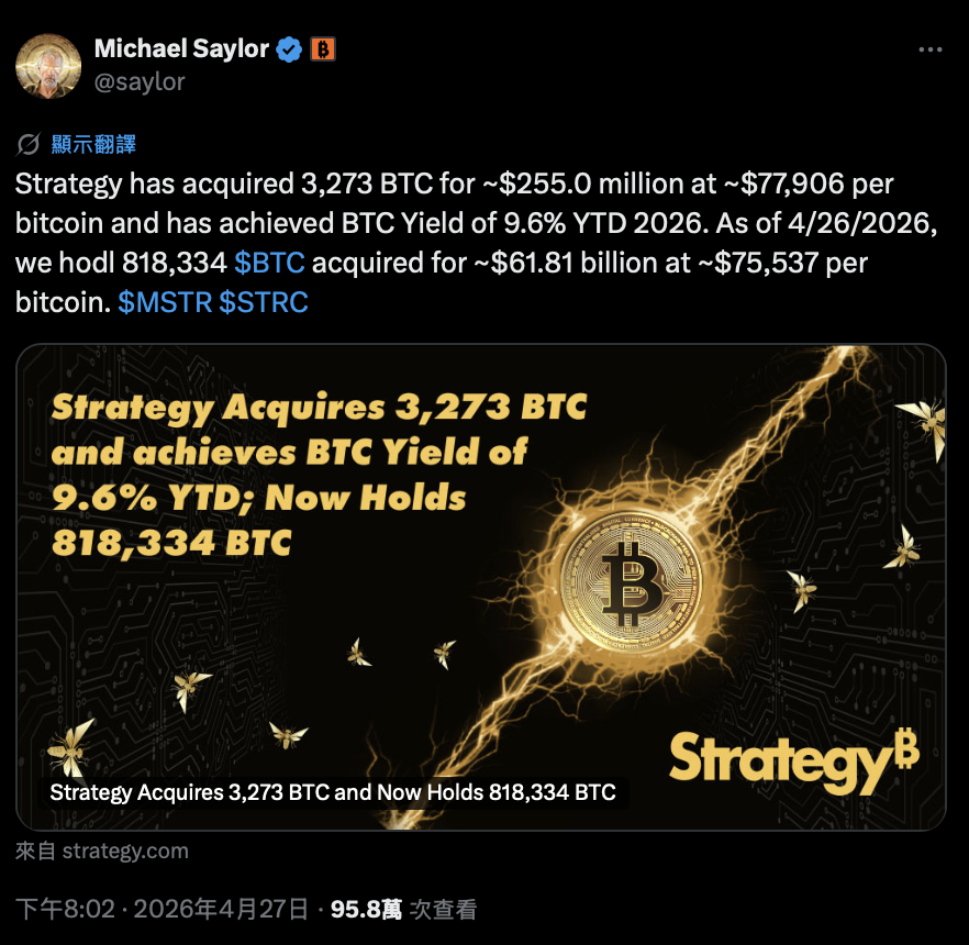 Згідно з документом 8-K, поданим до Комісії з цінних паперів та бірж США (SEC) у понеділок, у період з 20 по 26 квітня інвестиційний гігант Strategy (торгова марка на NYSE: MSTR) витратив близько 255 мільйонів доларів США, купуючи в середньому по 77 906 доларів за біткойн, додавши 3 273 біткойни.