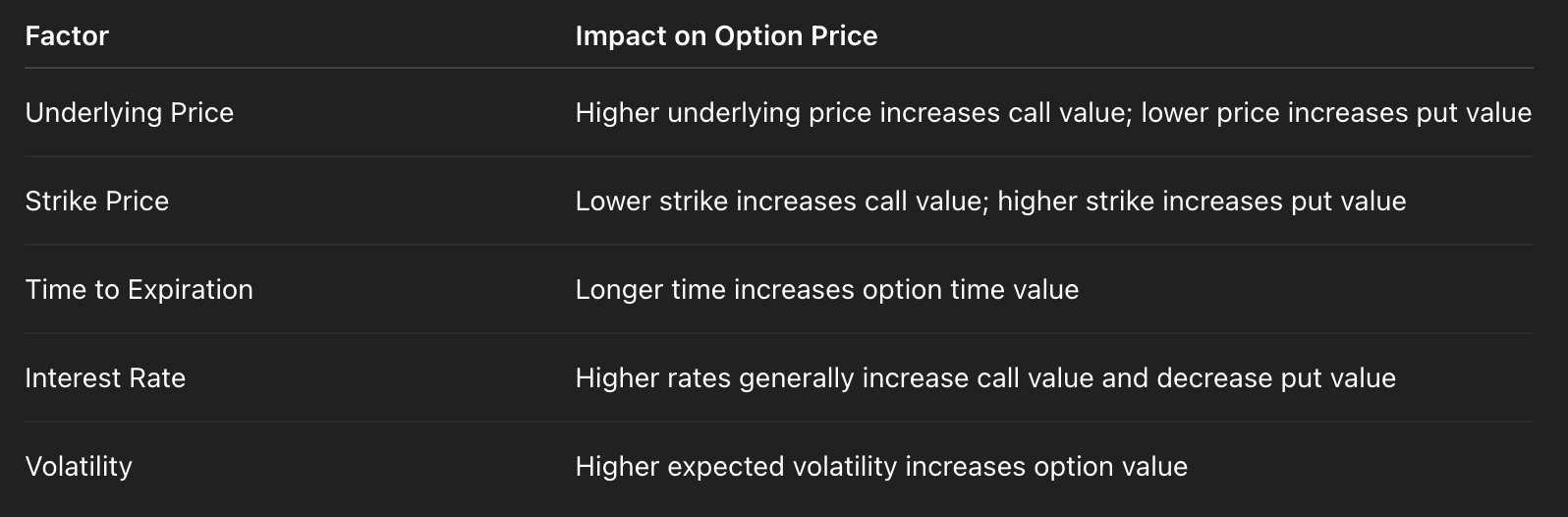 Giá options không chỉ bị ảnh hưởng bởi giá hiện tại của tài sản cơ sở mà còn bởi nhiều biến số khác:
