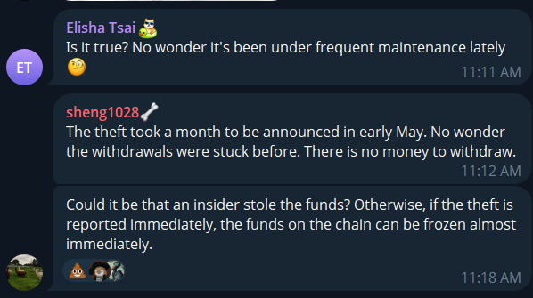 ! Một số nghi ngờ một người trong cuộc đằng sau các khoản tiền bị mất. Nguồn: Trò chuyện nhóm chính thức của BitoProMột số nghi ngờ là người trong cuộc đứng sau số tiền bị mất. Nguồn: Trò chuyện nhóm chính thức của BitoPro